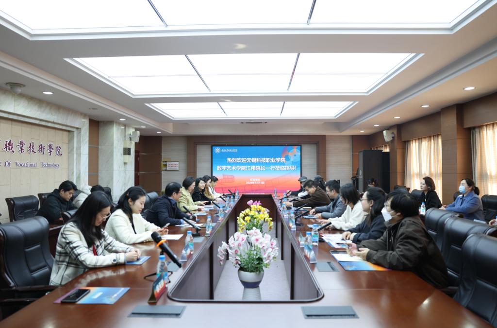 为贯彻落实江苏省职业教育教学质量提升行动方案(2026—2030年)相关精神,积极拓展校际合作空间,加强与兄弟院校的经验交流,1月16日,我院院长江伟、副院长王昱东率动漫系、数媒系全体教师组成的调研团队一行,赴无锡城市职业技术学院影视学院开展专题交流调研。无锡城市职业技术学院党委委员、副校长林俊,影视学院党政领导班子及教师代表对我院调研团队的到访给予了热情接待,影视学院党总支副书记徐群征主持会议。